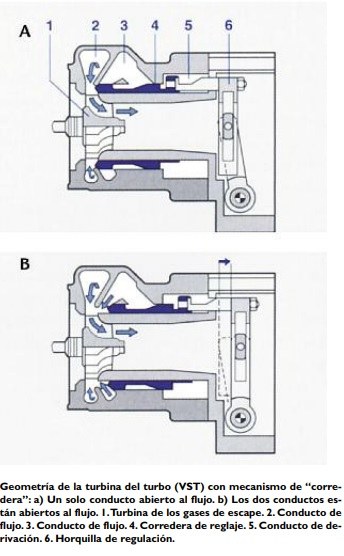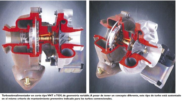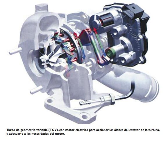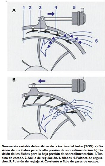 La válvula reguladora de la presión de sobrealimentación abre a la válvula “Wastegate”, y se reduce la parte del caudal de gases de escape que pasa por la turbina. El turbo TGV Los turbos con sistema de Geometría Variable (TGV), también denominados VNT, brindan otra posibilidad de limitar el flujo de gases en altos regímenes del motor. En los motores Diesel, el turbo TGV es utilizado plenamente en la actualidad, y en los motores de ciclo Otto está comenzando a usarse, y se impondrá en un futuro cercano. Uno de los inconvenientes a superar son las sobrecargas térmicas, generadas por los muy calientes gases de escape. Una variación de la geometría de los álabes regulables hace que se adapte la sección de flujo de gases y, por consecuencia, la presión del gas que actúa sobre la turbina, a la presión de sobrealimentación necesaria. En bajos regímenes, se deja libre una sección de flujo pequeña, de modo tal que el flujo básico de gases alcanza una elevada velocidad de la turbina que gira a altas velocidades.