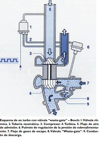 Cabe destacar que uno de los objetivos actuales del turbosobrealimentador –importante– es lograr valores máximos de par motor, a regímenes bajos e intermedios. El reglaje electrónico hace un importante aporte a la variación de la presión de sobrealimentación. Oportunamente hemos hablado de su construcción, y de su funcionamiento, a lo que agregamos los distintos tipos de turbo. El turbo con válvula “Waste-Gate” Es necesario que los motores alcancen un alto par motor, aún en bajas velocidades, y debido a ello es que el cárter o carcasa de la turbina se diseña para funcionar con un pequeño caudal de gases de escape. Con la finalidad de que con mayores caudales el turbo no sobrecargue al motor, se debe evacuar una parte del flujo al sistema de escape, por medio de una válvula de descarga, haciéndolo pasar por delante de la turbina. Esta válvula de tipo mariposa está normalmente integrada en el cárter de la turbina.
