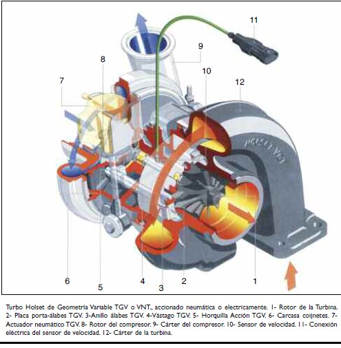 Con este tipo de turbocompresores, la válvula de descarga "wastegate" no es necesaria, ya que la presión de sobrealimentación es controlada, actuando sobre la inclinación de los álabes móviles.